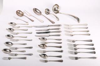 model Haags-lof en Hollands glad, waarbij diverse diner en dessert couverts, opdienlepels, mt. voornamelijk Fa. J.M. van Kempen 1858-1924 en Begeer & Vos Voorschoten, 2e gehalte, vele met lettergravure en datering
