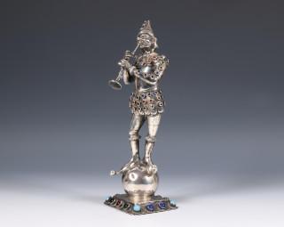 staande op een bal en blazend op een fluit, ingelegd met glazen faux kleurstenen, niet gekeurd, 2e gehalte