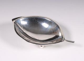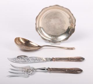 w.o. een dienlepel, mt. Zilverfabriek Voorschoten, 1957, een gegraveerd schaaltje, gekeurd met zwaardje, daarbij een verzilverd visdienbestek