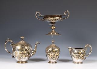 bestaande uit een theepot, tazza, melkkan en suikerpot, alle met vergulde opgelegde decoratie van vlinders tussen bloemenranken, mt. Fa. J.M. van Kempen & Zonen, Voorschoten, 1867, 1e gehalte