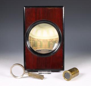 hierbij koperen microscoopje en opvouwbaar vergrootglas.
