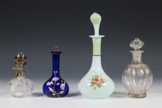 Hierbij drie (opaline) glazen prfumflessen met schildering van bloemen.