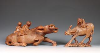 China, two wood carvings of boys on water buffalo, ca. 1900, both carved with boys seated on the back of a water buffalo (condition: the largest with split to wood running over the back of the animal and first boy, both with some wear)