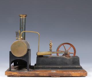 Uitgevoerd met verticale ketel, overbrenging naar dynamo. op gelithografeerde blikken vloer. geheel op houten basis.