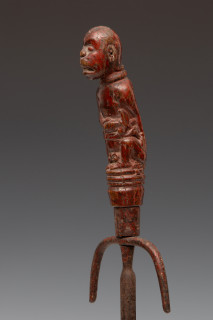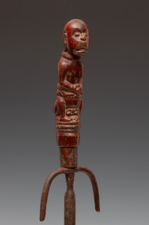 the handle carved as a squatting figure dressed in loin cloth, his right hand holding the hilt of a kris. The head with expressive details, partly covered in red pigments. Provenance Old Dutch collection.