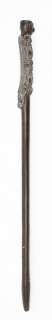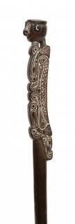 PNG, Massim, wooden staff, topped by a stylized anthropomorphic figure, details in white pigment,