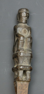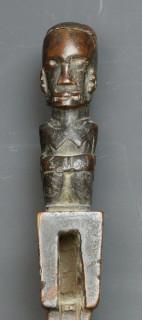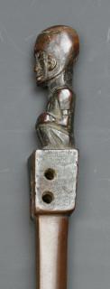 one side with floral pattern, the end with a crouching Singha figure and topped by a squatting male ancestor figure and at the top and back of the head a hole. Provenance Old Dutch collection.