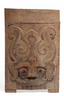 Sumatra, Toba Batak, wooden rectangular architectural pannel decorated with a Singa head