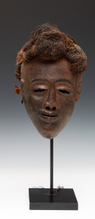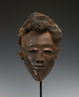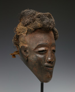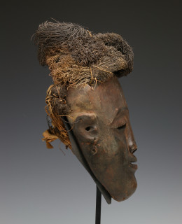Zambia, face mask, with plant fiber hair dress, one ear-ring, red and black pigments, early 20th century