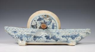 China/Thailand, blauw-wit porseleinen bootvormige vijzel met schijfvormige stamper, modern,