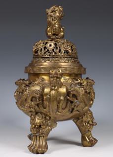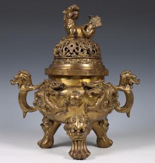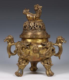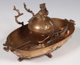 China, bronze censer and cover and copper alloy inkset, 20th century, the censer modelled with dragons and qylin, the oval inkset with flowerin branches and shishi (retouches)