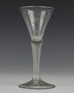 op ronde voet, transparante slingers in de stam. De Kelk met gravering: Abramham Ongelaar, 1762, alsmede een zonnebloem en maretakken.