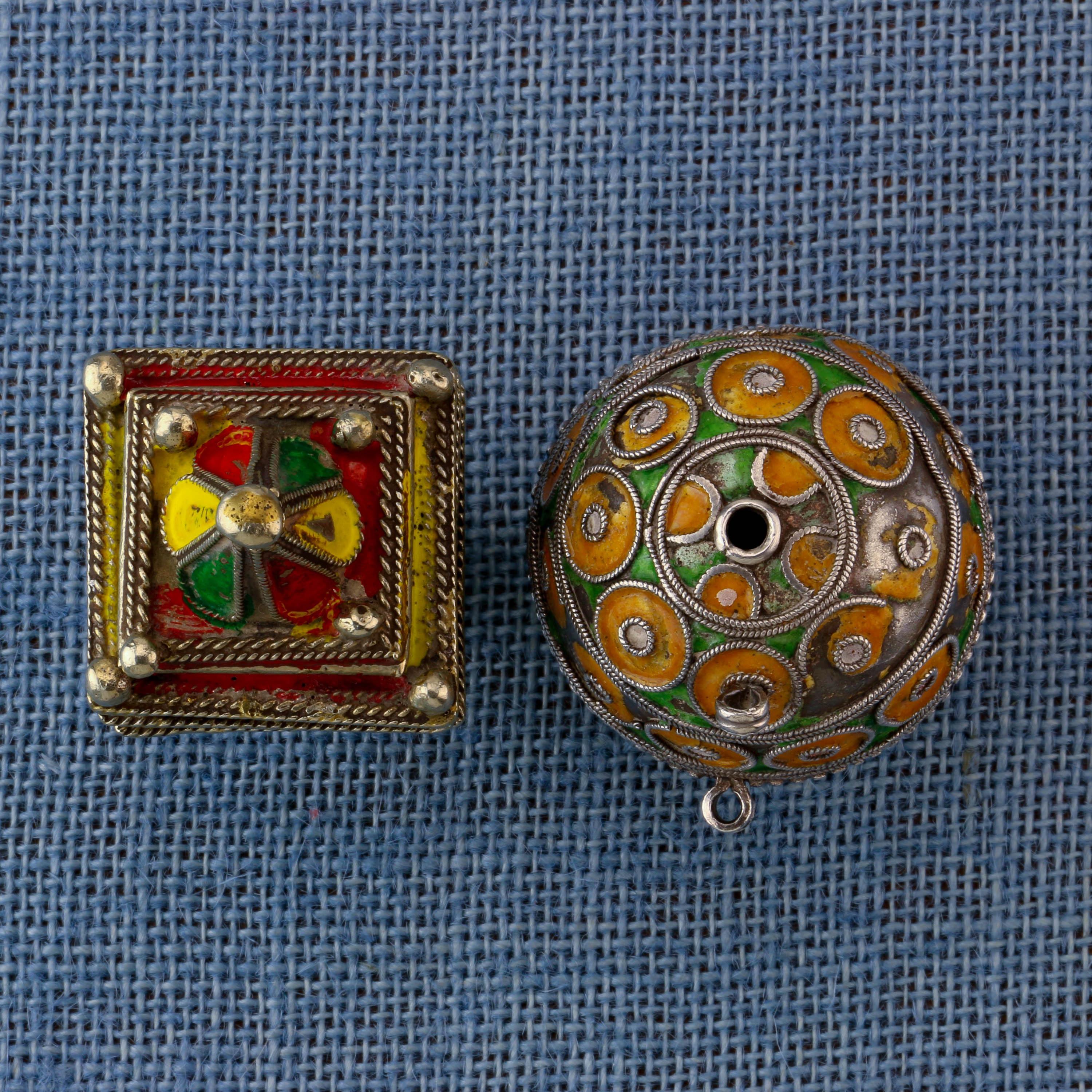 the enameled hair ornament is ring-shaped and is meant to hold aromatic herbs, ref: Splendor of Ethnic Jewelry, page 42. Western Anti-Atlas, the bead is decorated with yellow and green enamel, ref: Magisch Marokko. Mauritania, two Tuareg amulets