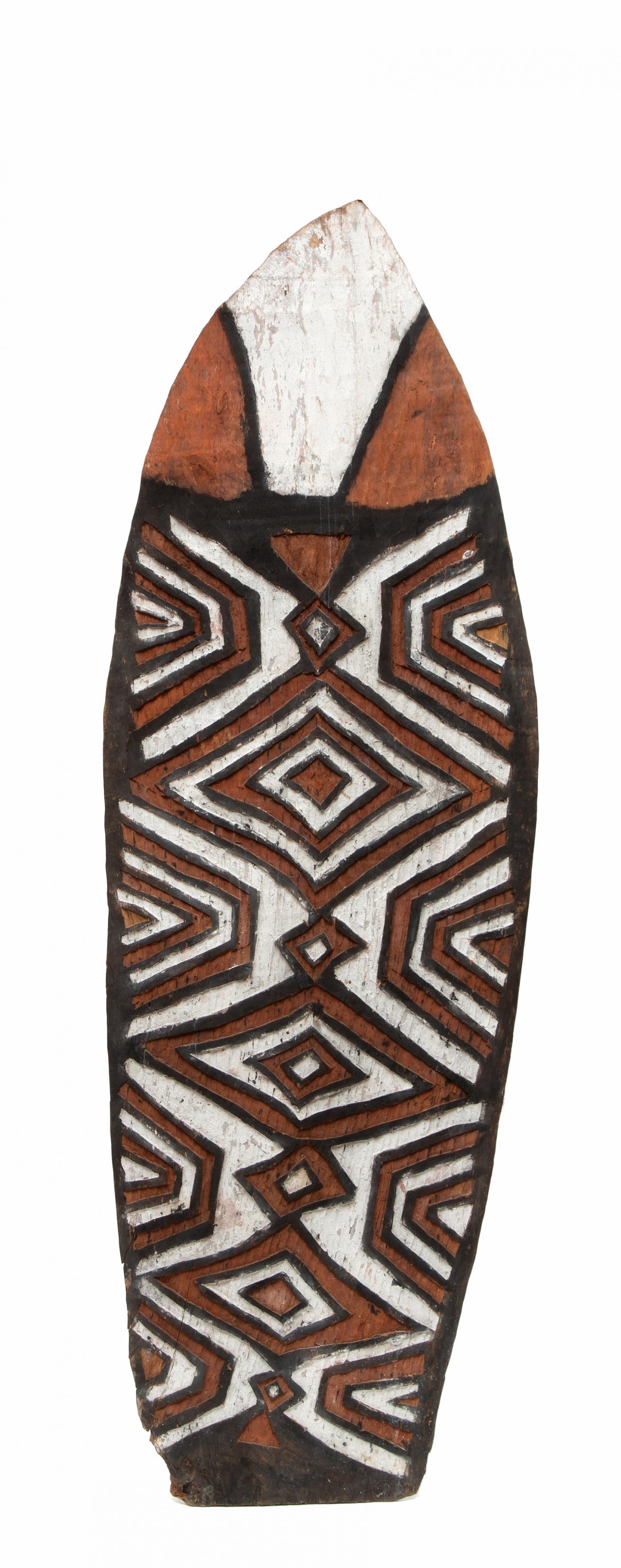 Papua, Citak, wooden shield with clear and bright carved pattern in black, red and white pigments.