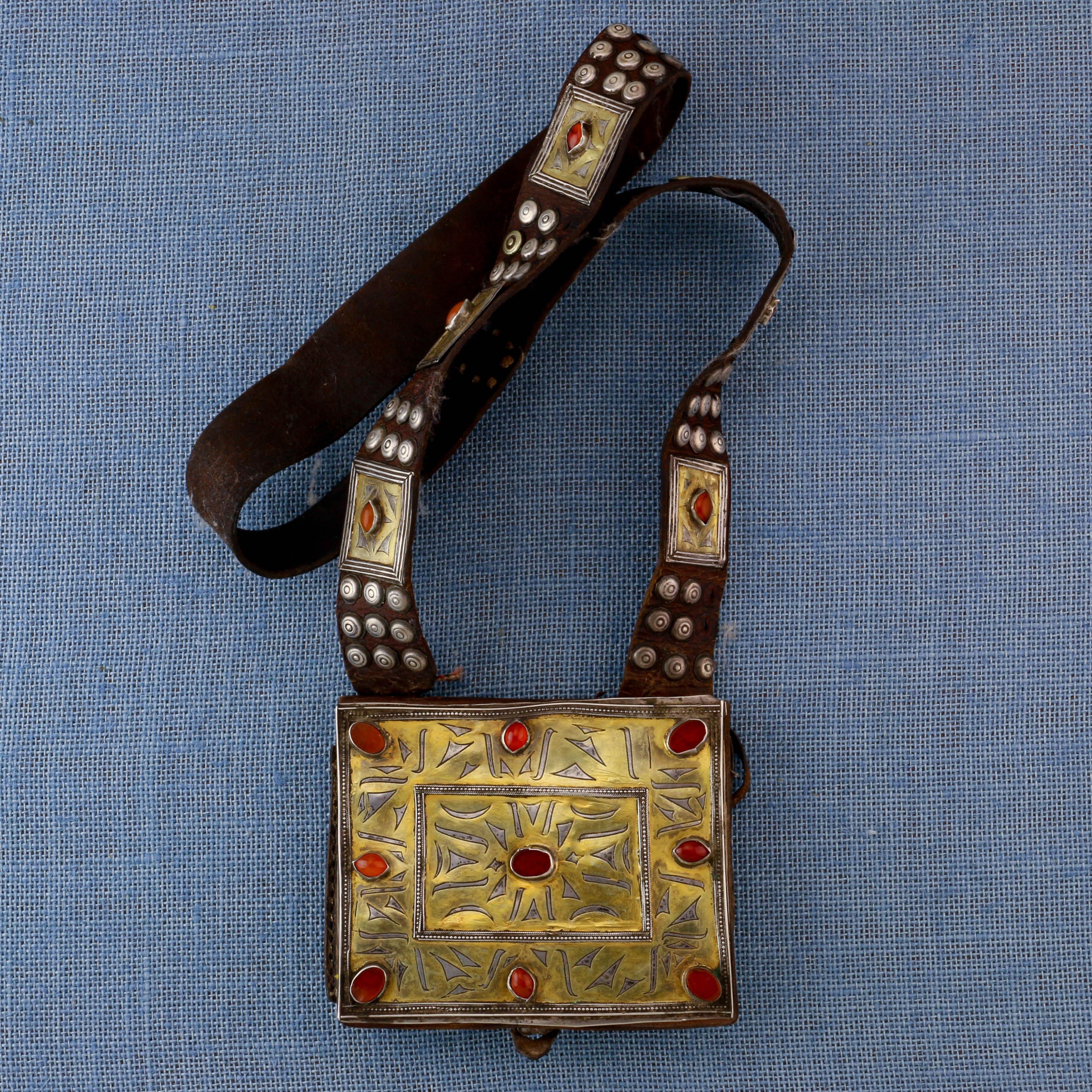 decorated with fire gilding and cornelians, the trap decorated with silver rectangular ornaments. Worn across the shoulder by older Teke women, ref: Ethnic Jewelry, page 85