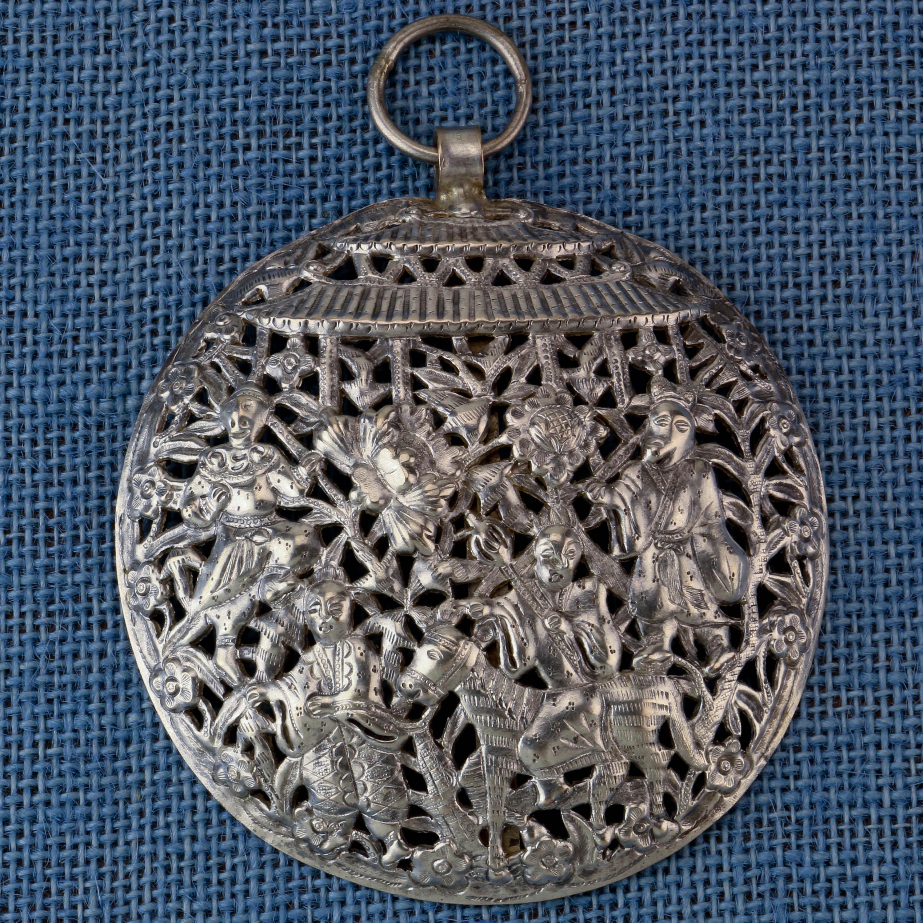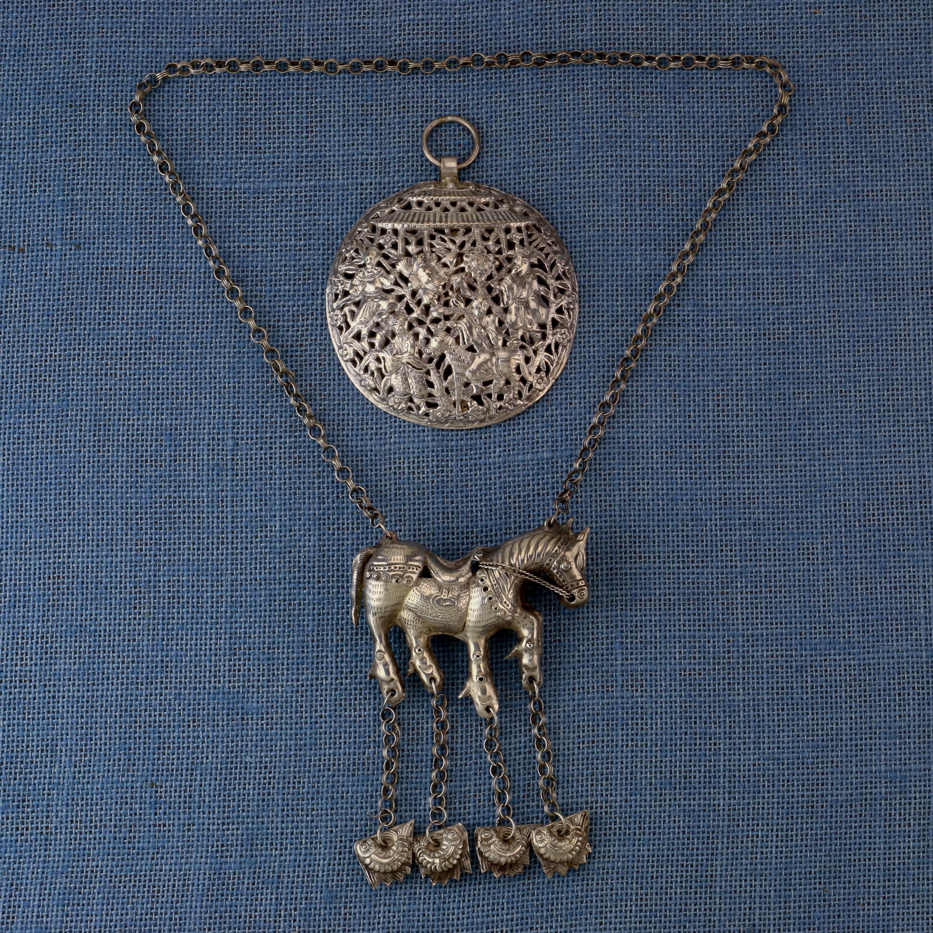 China, Miao, horse amulet chain necklace and amulet with four figures and a horse
