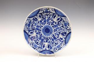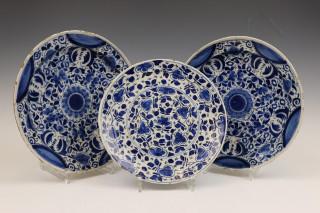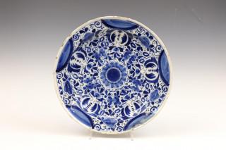 Delft, paar blauw-wit aardewerk borden en pannekoekbord, 18e eeuw,