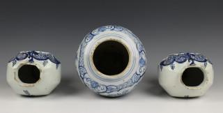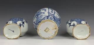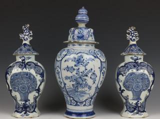 Delft, De Porceleyne Bijl, paar blauw-wit aardewerk dekselvazen en balustervormige dekselvaas, 18e eeuw