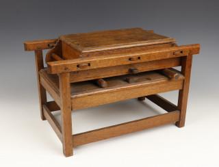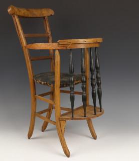 Eikenhouten poppen linnenpers, rolpers en vruchthouten poppenstoel, ca. 1900