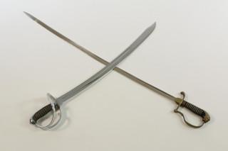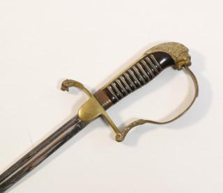 kling gesigneerd Carl Eickhorn Sollingen en is tevens voorzien van stadswapen van Amsterdam. Greep bekleed met vissenhuid en draadomwikkeling. HIerbij een sabel M1912, zgn. Leeuwenkop sabel, ca. 1900,