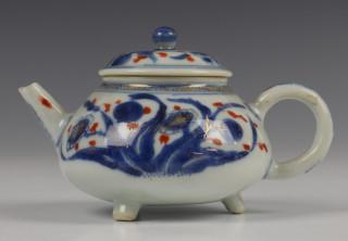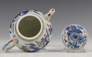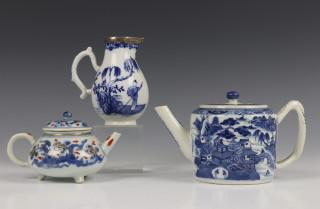 condition: the Imari teapot with firing flaws around the feet, grazed chip to handle, tiny chip to spout, tiny hairline to rim; the blue and white teapot with small chips to the interior rim; the milk-jug with small nick to handle and the rim is not examined due to metal mount