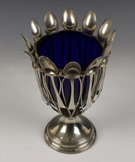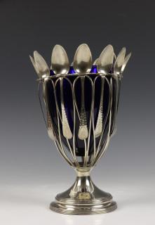 ajour vaasvormige houder met twaalf gegraveerde lepeltjes en blauw glazen binnenbak, mt. Peter & Ann Bateman 1791, sterling, 1e gehalte, voetrand licht gedeukt,