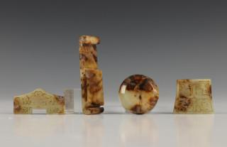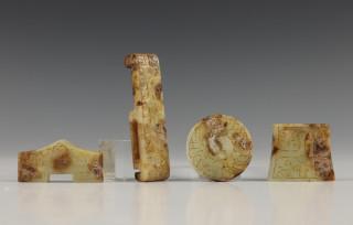 China, collection of four jade archaistic objects of cream and russet jade, comprising a belt hook and three sword fittings