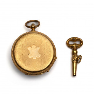 18krt. Gouden damessleutelhorloge en een opwindsleutel, begin 19e eeuw,