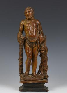 staande houding met in zijn rechterhand een knots, de linker hand rustend op een boomstronk met leeuwenvel. Geplaatst op een houten sokkel. (beschadigingen)