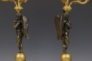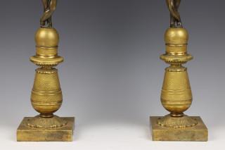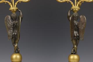Frankrijk, een paar bronzen vuurvergulde en deels groen gepatineerde drie lichts kandelaars, Empire;