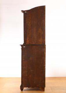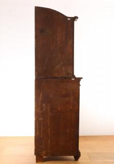 in twee verdelingen. De bovenkast met gebogen kap, waaronder twee deuren met ruiten in vakwerk. De onderkast met twee deuren. Geen sleutels