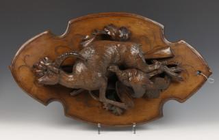 Duitsland, een stel gespiegelde houten 'zwarte woud' wand plaquettes met voorstelling van jacht trofeeën , ca. 1900,