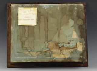 Op de voorgrond een boeren echtpaar op het erf van een boerderijtje, waarnaast de hooiberg. Op de achtergrond een rivier met scheepjes, brug met figuur en kerktoren in de verte. Geheel in mahoniehouten lijst. Volgens etiket op de achterzijde vervaardigd door Wiggers van Kerkhem (1787-1868), Generaal in het Nederlandse Leger.