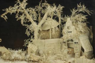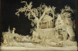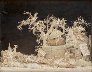 Papieren driedimensionaal knipsel ofwel bavelaar met zwart stoffen achtergrond, vroeg 19e eeuw.