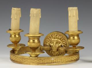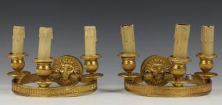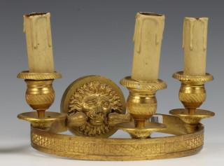 Frankrijk, een stel vuurvergulde bronzen 'hoepel' drielichts wand appliques, Empire;
