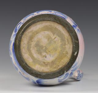 florale schildering, in blauw-wit met deels mangaan omlijning. Op tinnen standring.