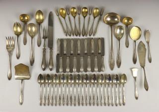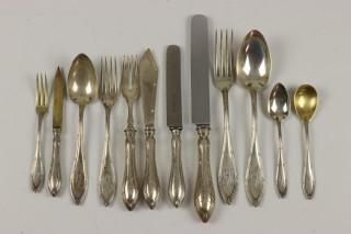 puntfilet met filetranden en monogram versierd, deels verguld bestaande uit: veertien dinercouverts, elf dessertcouverts en twee idem lepels, vierentwintig viscouverts, vier opdiencouverts en twee opdienlepels, tweeëntwintig vruchtencouverts en twee idem mesjes, vijfentwintig ijslepels, twaalf dessertlepeltjes, en achtendertig dinermessen, drieentwintig kleine messen en achttien stuks opdiengerei, mt. Koch & Bergfeld Bremen (vanaf 1859) ca. 1900, 800st., 3e gehalte.