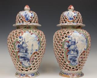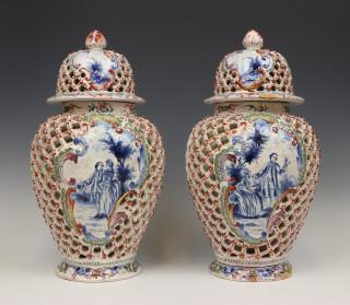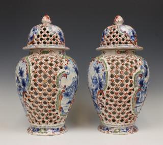 de schotel met decor van een pauw. De dekselvazen dubbelwandig met ajour werk. Geschilderde scenes van landschappen en figuren in Rococo stijl medaillons, 19e eeuw, (beschadigingen en herstellingen).