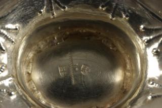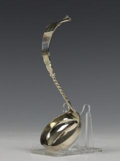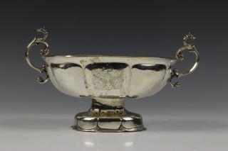 ovaal en achtlobbig model, kom en voet, voorzien van staande S-vormige open oren met drakenkopjes, gravering wapengravure en initialen J. v. H., mt. Arent Hamminck 1672/1673, herstellingen, lepel mt. wed. Kuijlenburg Schoonhoven 1878, 2e gehalte.