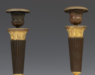 Frankrijk, paar vuurvergulde en bruin gepatineerde bronzen kandelaars, Charles X,