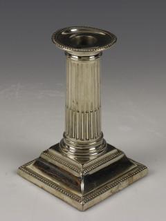 op vierkanten verhoogde voet, zuil met cannelures versierd, ronde kaarsenhouder, mt. Walker & Hall Sheffield 1894