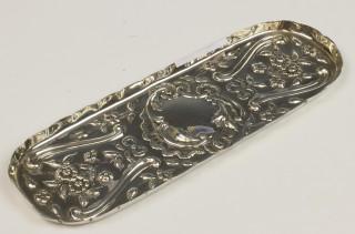 langwerpig met gedreven versiering van o.a. bloem, blad, strik en acanthusbladmotieven, geschulpte rand, mt. William Comyns & Sons ltd Londen 1896