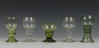 Een stel blank glazen roemers met floraal gegraveerde kelken,