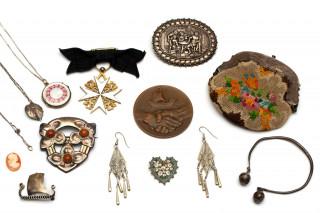 w.o. een broches, oorhangers, beursje, maltezer kruis en een penning