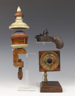Hierbij een zonnenwijzer en een naaigarnituur in de vorm van een houten klem, ca. 1920.