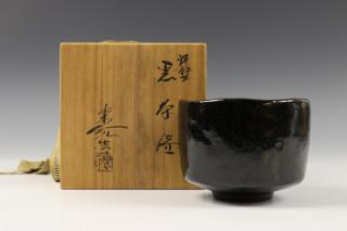 Japan, black Raku teabowl (chawan), signed, 20th century, with original wood box