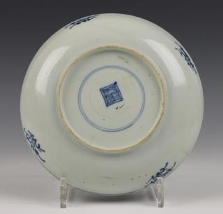 China, two blue and white porcelain plates, one decorated with Shoulao on his deer, the other with lotus, 18th century (cracks)