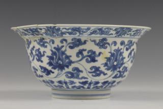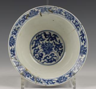 China, two blue and white porcelain bowls, one with a continuous decoration of elegant figures on a terrace, the other decorated with lotus scroll (both reglued and with damages), Kangxi
