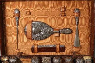 kristallen flacons met zilver montuur mt. Charles Fox & Co Lt., Great Sutton Street, Clerkenwell Londen, met krokodillen lederen etuis, diverse items bekleed met krokodillen leer in idem leren koffer met canvas beschermhoes, adres: Manchester, Finnigan, samengesteld, incompleet,
