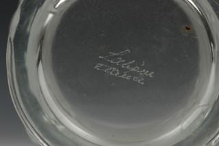met eikenblad motieven in reliëf ges. aan de onderzijde Lalique, France. Hierbij zeven wijnglazen met holle stam.